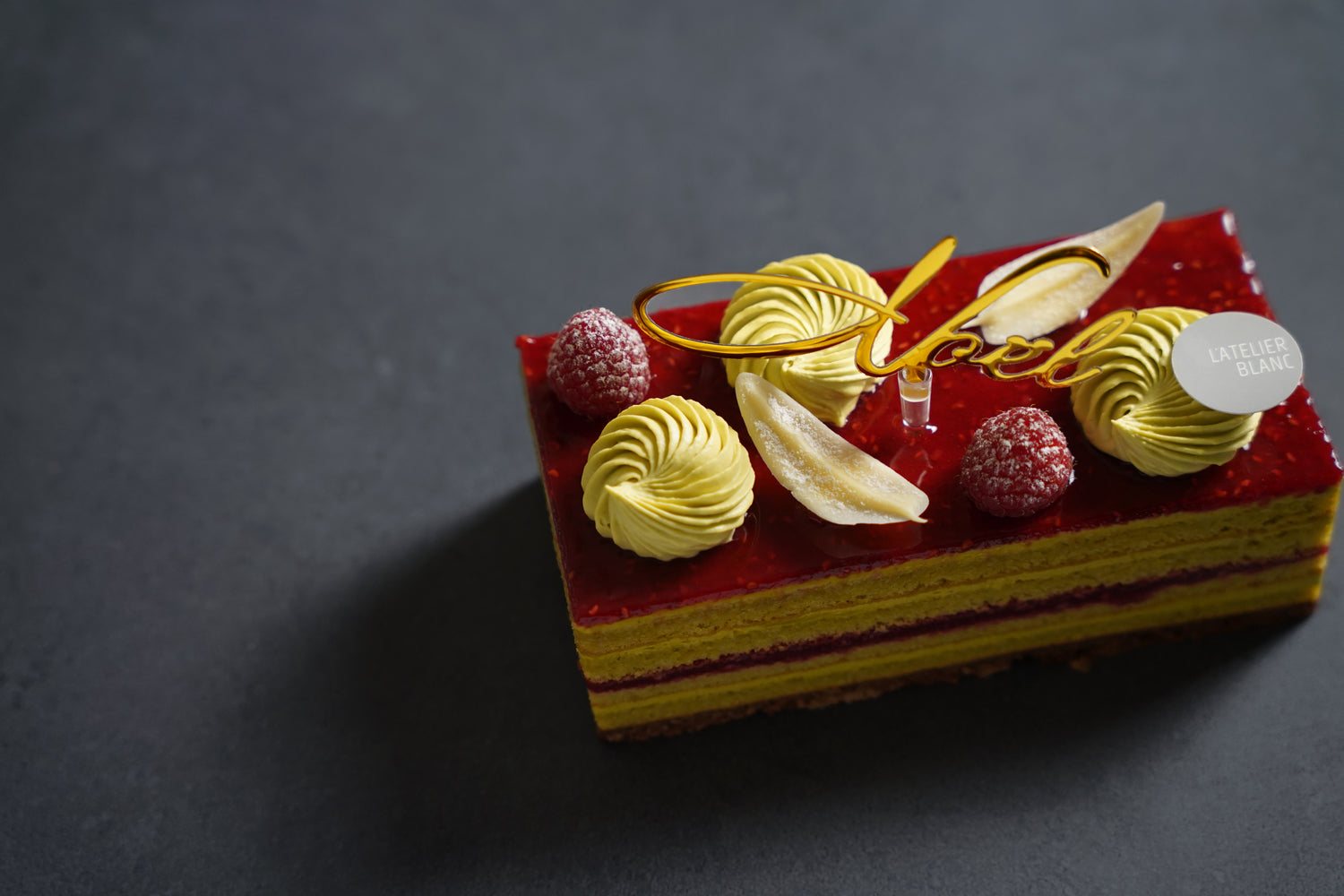 濃厚なピスタチオのバタークリームにフランボワーズクーリー、下段にはサクサクのフィヤンティーヌ、ガナシュショコラ。