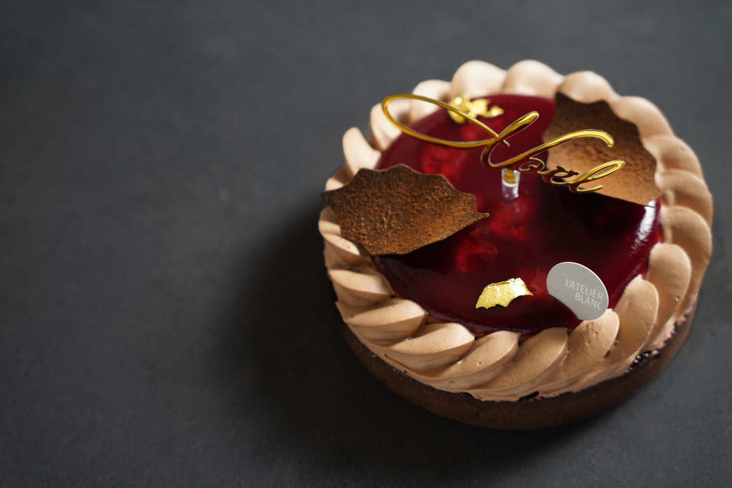 ショコラのタルト台にグリオットチェリーのコンフィチュール、ハイカカオのショコラムースにグリオットチェリーとカシスのコンポートとジュレ。