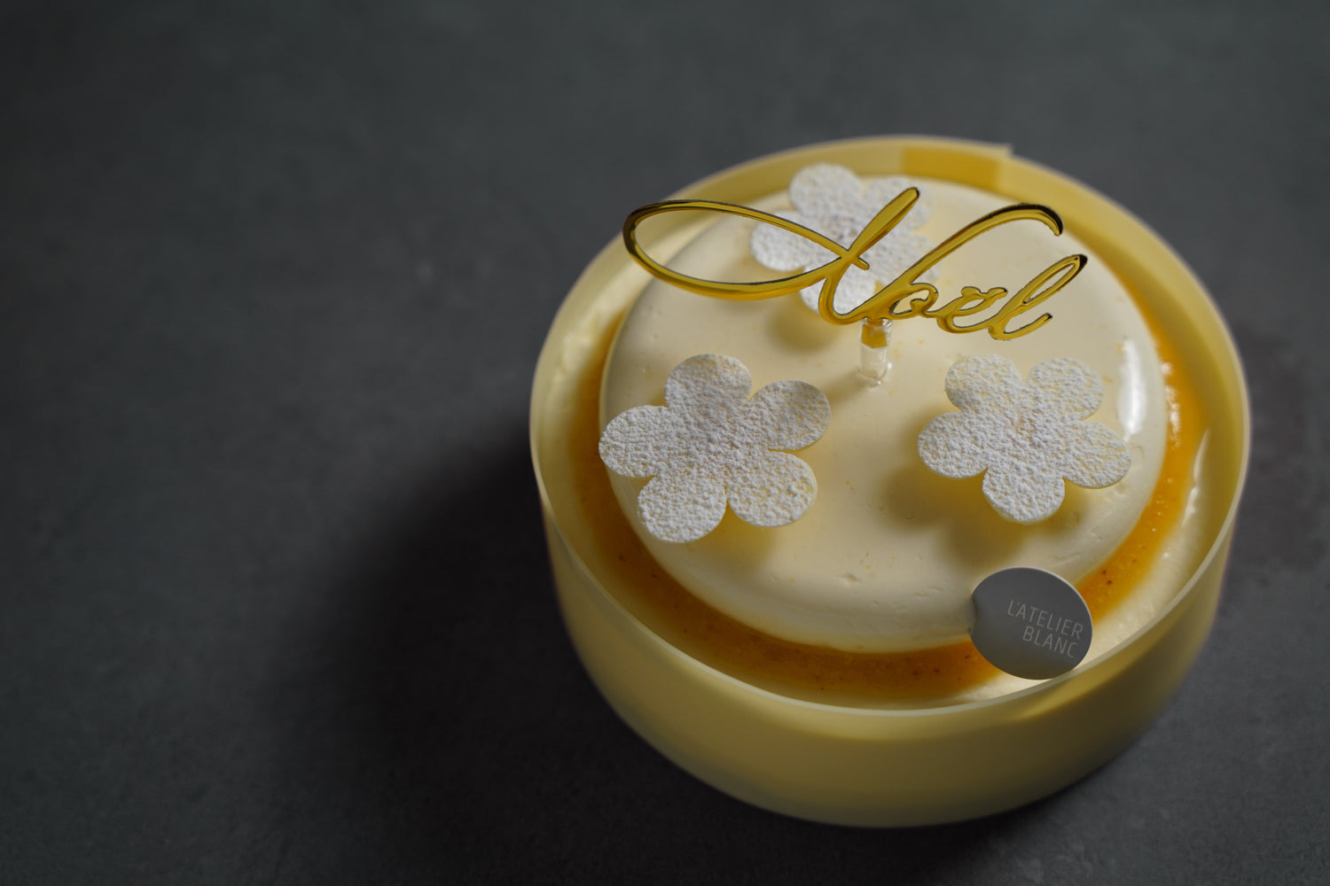 軽めのムース柚子に木頭柚子のコンフィチュール、フロマージュブランとマスカルポーネのムースにクレーム柚子。下段にはサブレ。